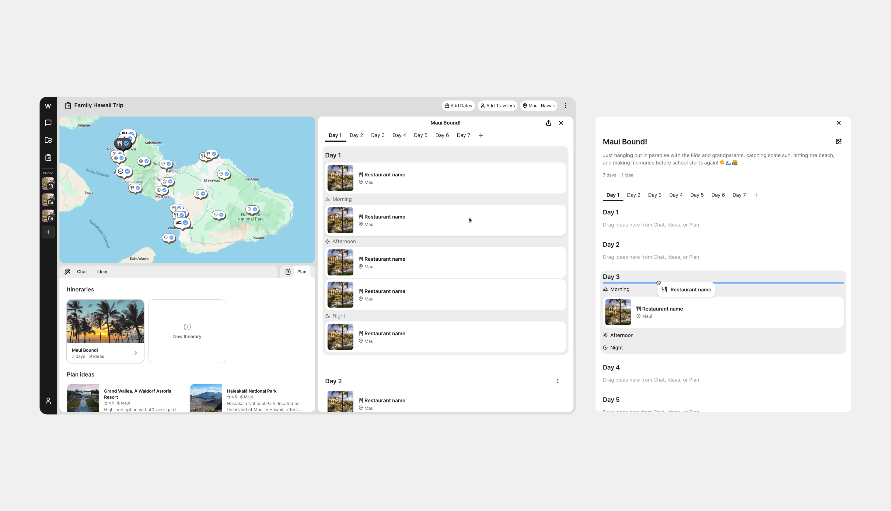 After launching our mobile app in beta, we started work on our web app for fast iteration and to accelerate user adoption. The product featured a dynamic canvas that adjusted to the user’s focus as they interacted with points of interested, view recommendations, or built itneraries.